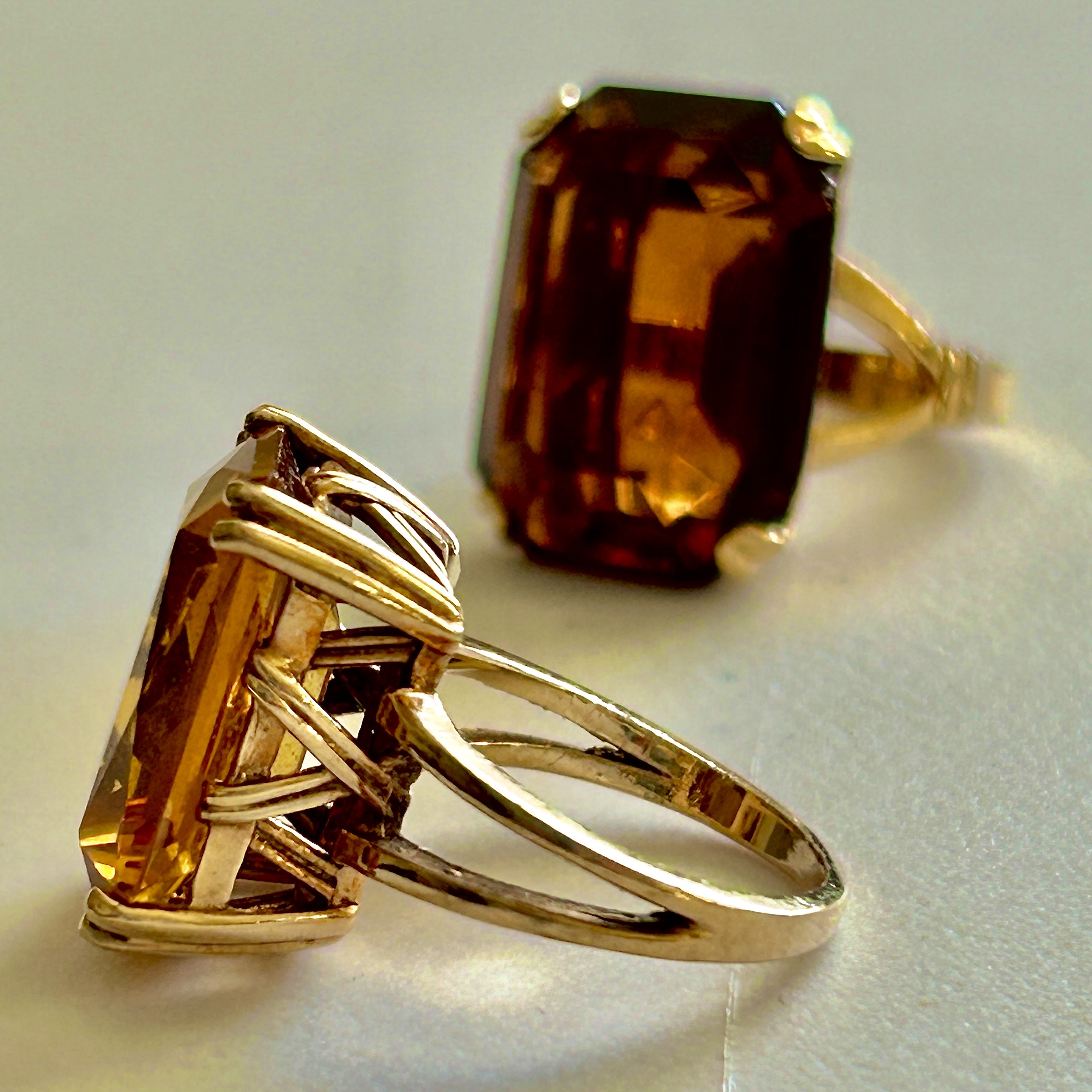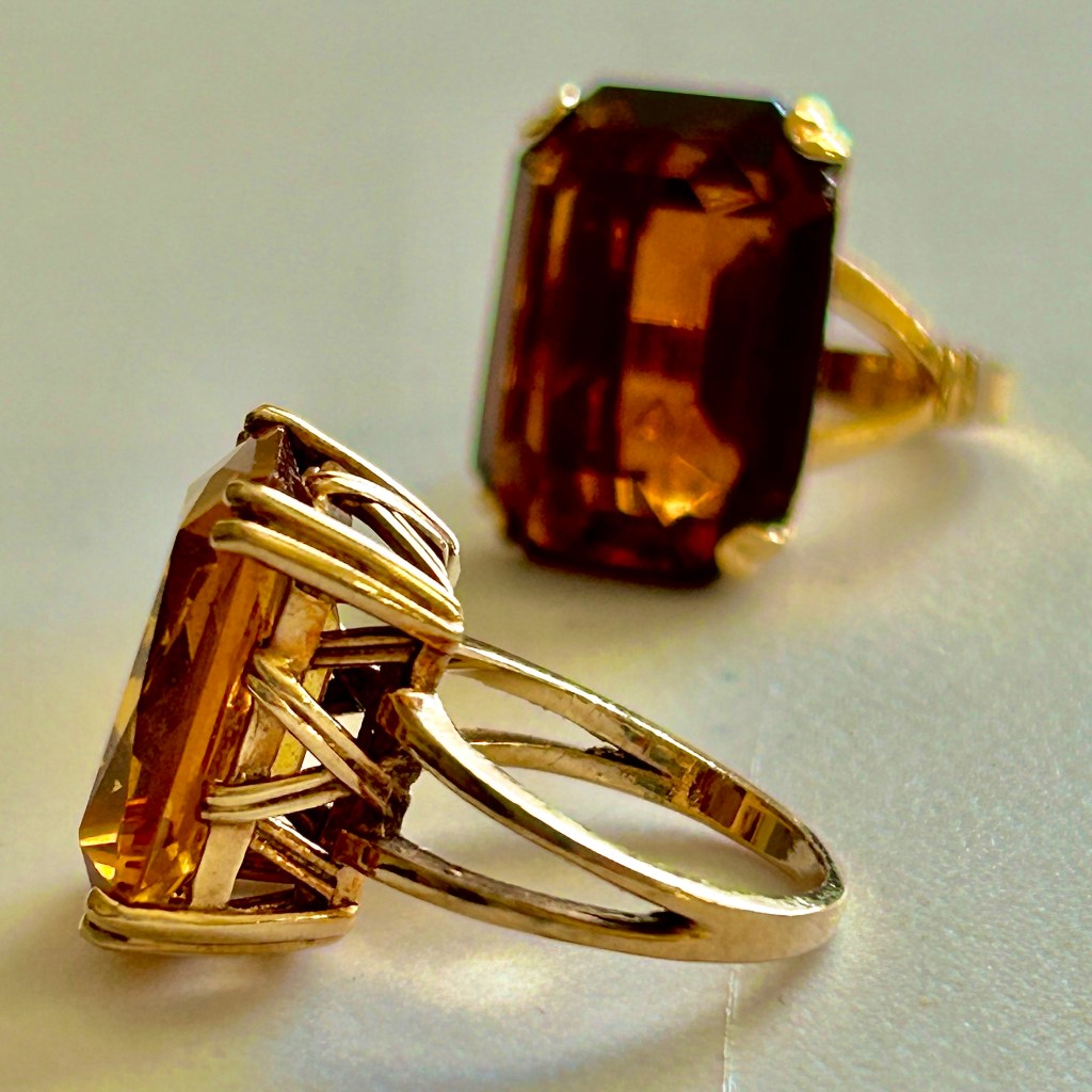 My mom loved bling. Especially on her fingers. In my jewelry box are huge gold rings with large citron, smoky topaz and aquamarine stones. I remember seeing her wear the smoky topaz as a child but I think the other rings were given to her by suitors after I left home. Their settings give off a late 1970’s big hair lounge lizard vibe.