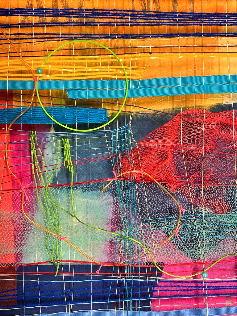 Instead I’ve been working on two small aluminum picture frames that I’m repurposing as looms and a large 24×36 inch piece. Contrary to everything I just wrote, the larger work is on a loom, where it will remain. This rustic loom, a rectangle of reclaimed wood with pin nails to hold the warp, was made years ago by someone else and given to me by a friend. I’ve attached a collage I created with tissue paper on foam core with the stenciled text ‘looking at art reminds us that we are not alone’ to the back so that the loom frames the collage. The weave hovers an inch above the collage. And what a weave it is. I chose a palette far removed from the swampy browns of my earlier photo encaustic work. It is off the charts bold, bright and neon. I chose cotton, wire and monofilament for the warp and more wire, embroidery floss, beading, produce netting and the funny plastic stuff we made lanyards from when we were kids for the weft. I tied warp threads together and l’ve let the weft hang in places like stray hairs. The viewers eyes have to dodge around the threads and wire in order to find the text hiding beneath it all.