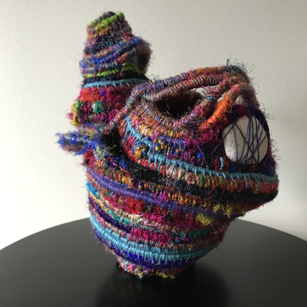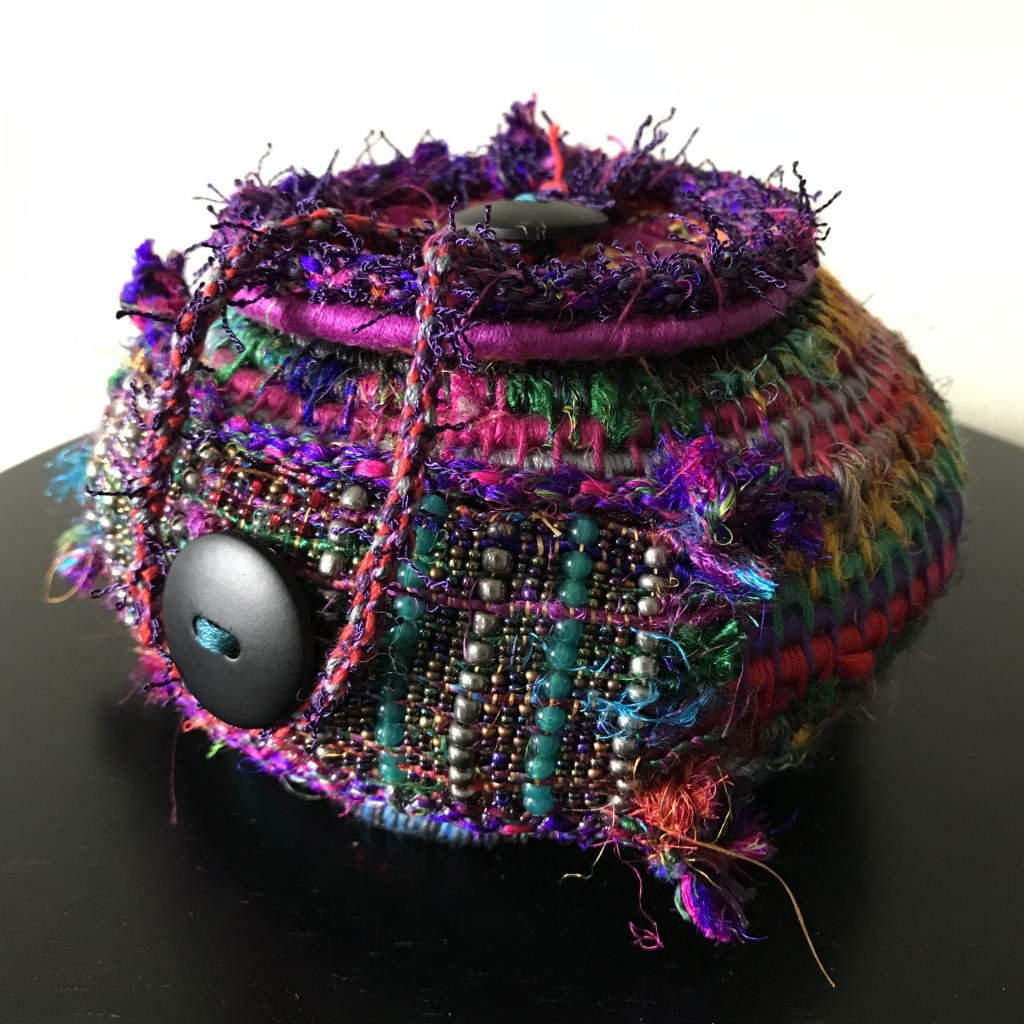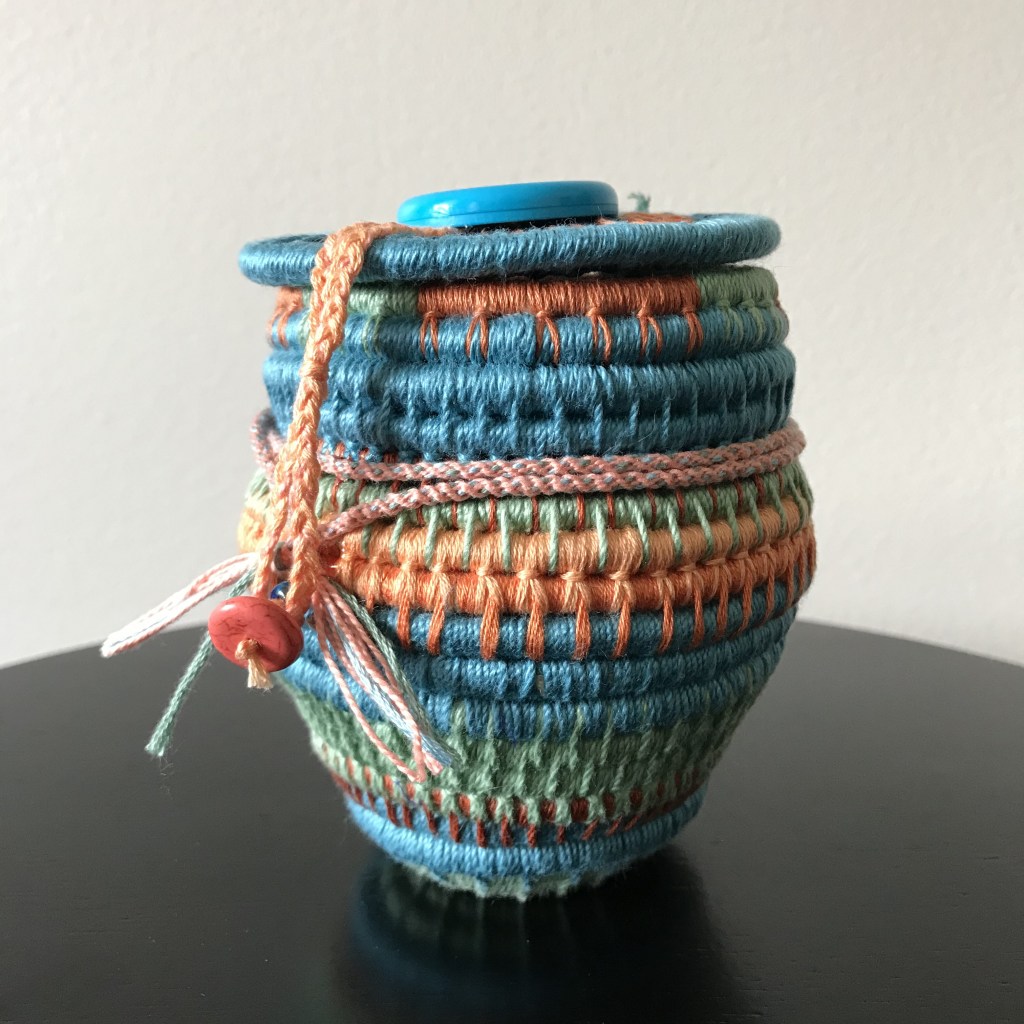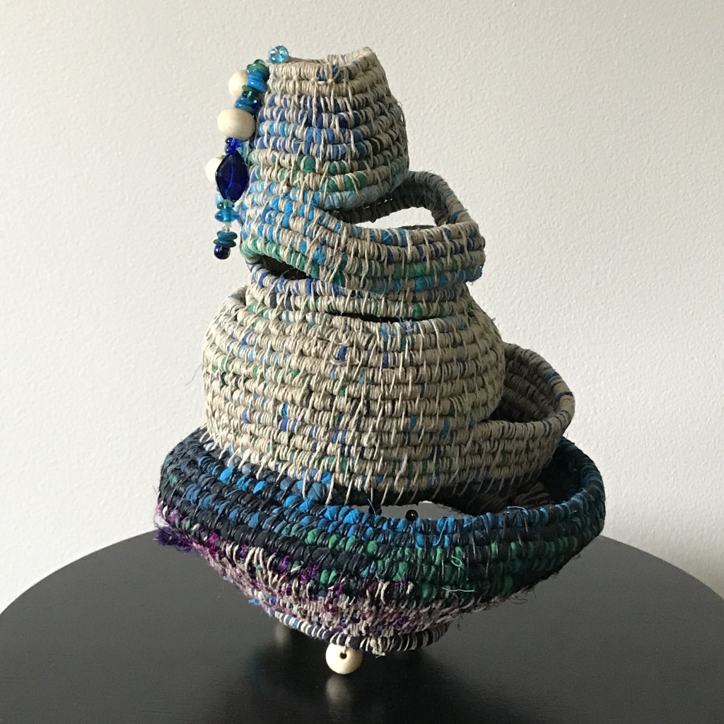 Coil baskets created with embroidery thread, saree silk and rat tail around a cotton rope.
