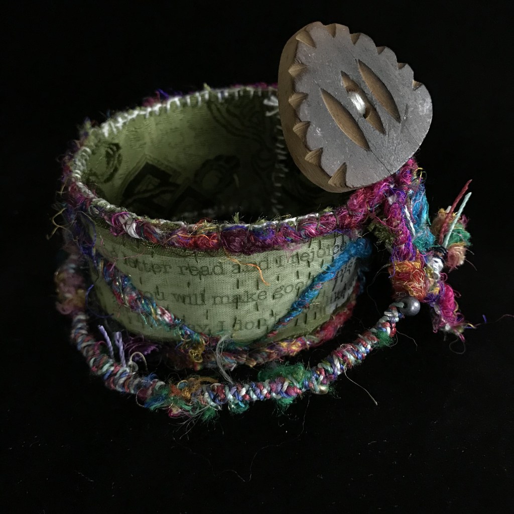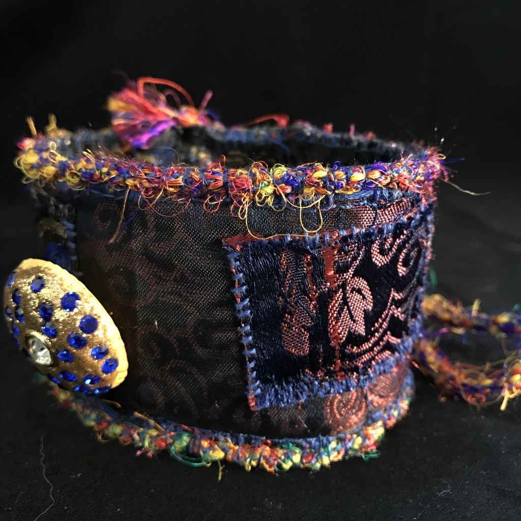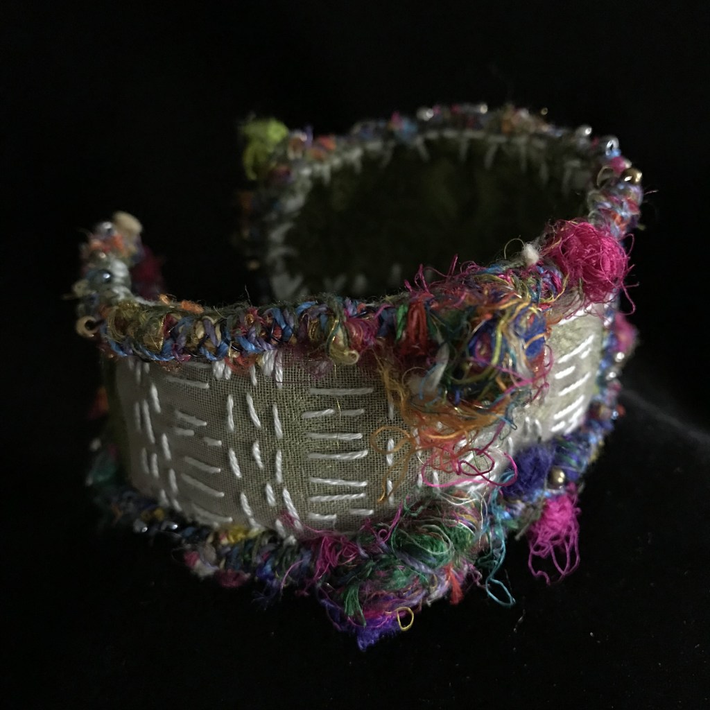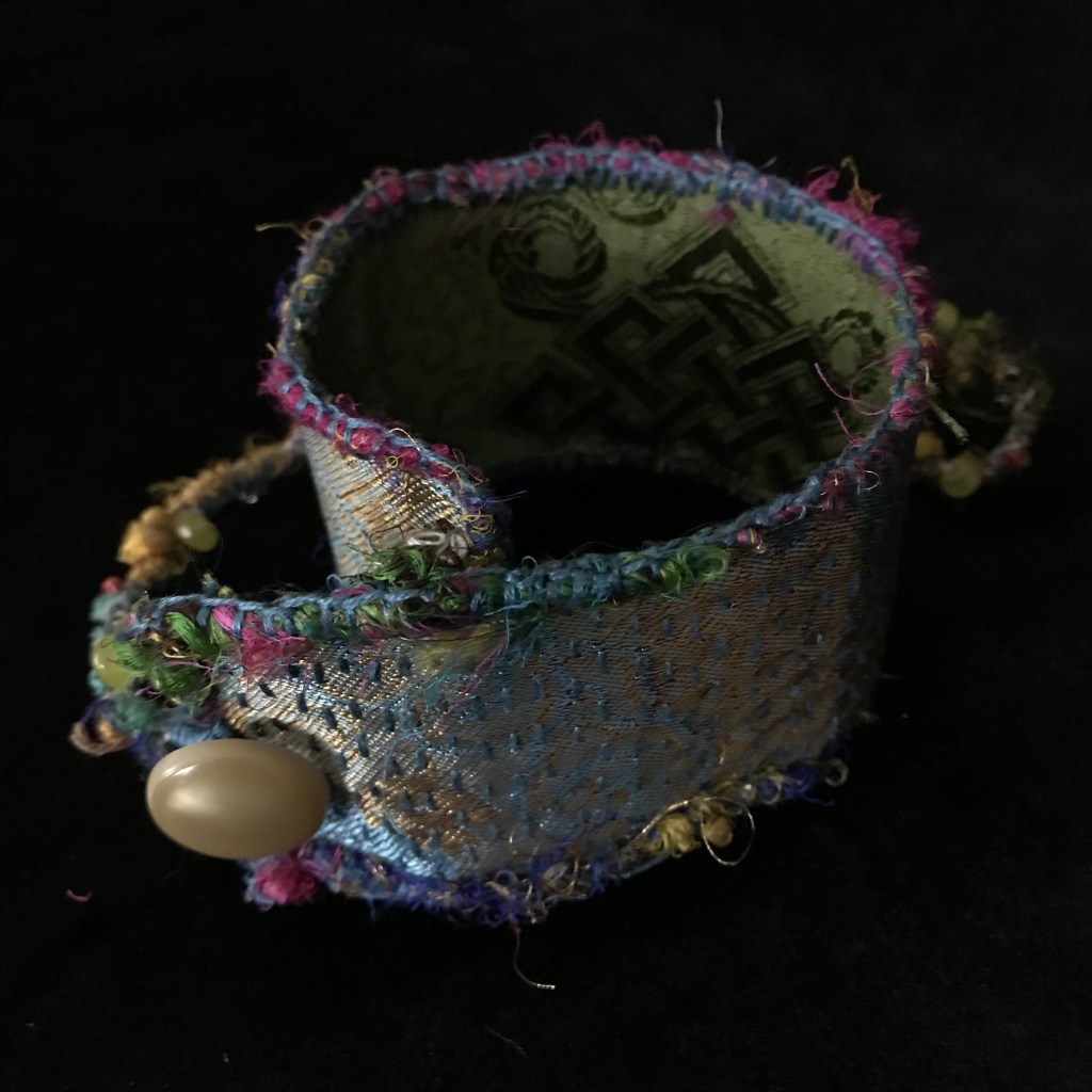 These cuffs are hand stitched in silk with saree silk trim, embroidered details and kumihimo braided closures. One size fits most wrists.